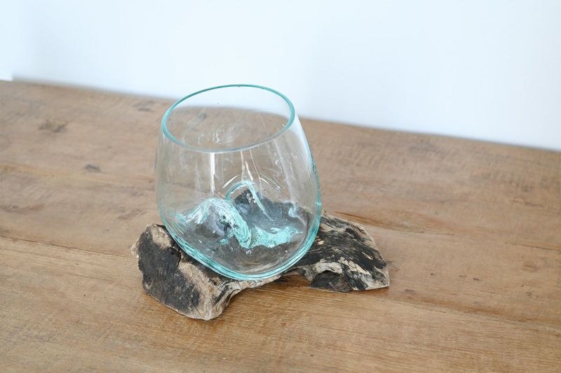 天然の流木にガラスボウルをそのまま当て込んで型取りをした、他にはないユニークなデザインのガラスベースです。 個性的な木の土台は、オブジェのようでもあり、そのまま飾っても、雰囲気のあるインテリアに。 ひとつひとつ形が異なる一点もののアイテムですので、お好みのデコレーションをお楽しみください。