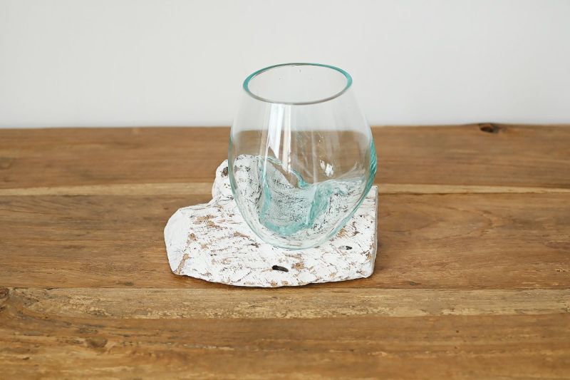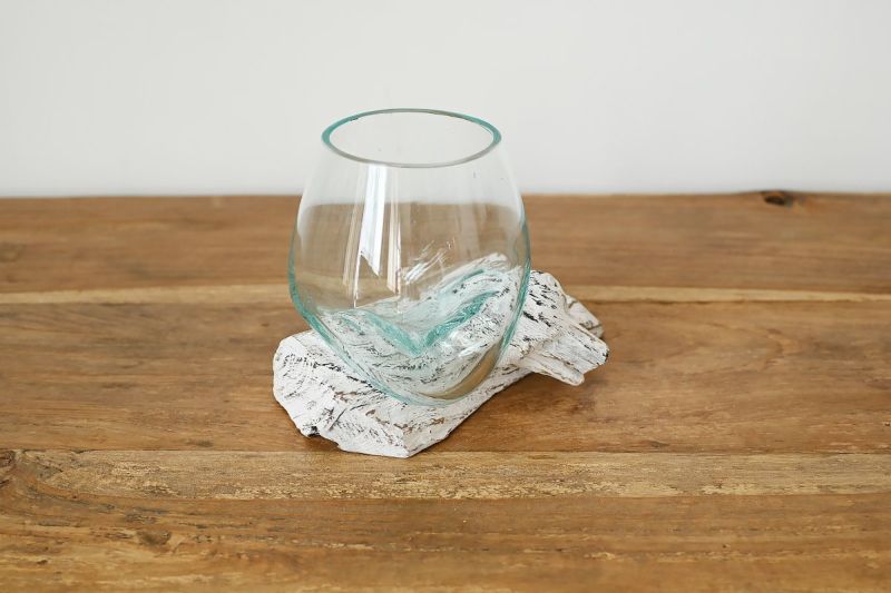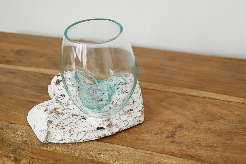 天然の流木にガラスボウルをそのまま当て込んで型取りをした、他にはないユニークなデザインのガラスベースです。 個性的な木の土台は、オブジェのようでもあり、そのまま飾っても、雰囲気のあるインテリアに。 ひとつひとつ形が異なる一点もののアイテムですので、お好みのデコレーションをお楽しみください。