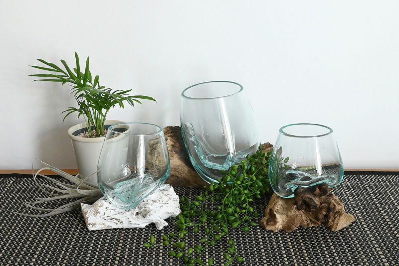 流木にガラスボウルをそのまま当て込んで、型取りをした他にはない独特のかたちのガラスベースです。個性的な木の土台は、オブジェのようでもあり、そのまま飾っても、雰囲気のあるインテリアとして役立ちます。また、見る角度によって、いろいろな表情を見せます。ひとつひとつ形が異なる一点もののアイテムです。