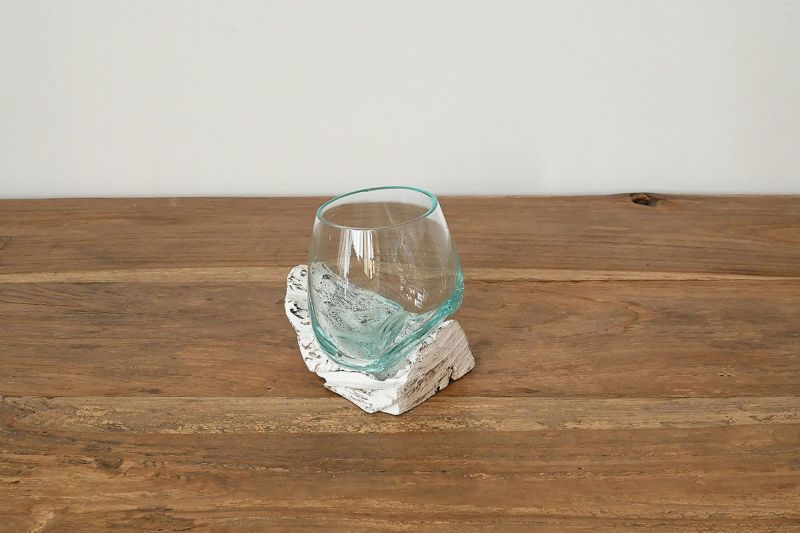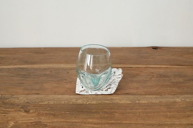 天然の流木にガラスボウルをそのまま当て込んで型取りをした、他にはないユニークなデザインのガラスベースです。 個性的な木の土台は、オブジェのようでもあり、そのまま飾っても、雰囲気のあるインテリアに。 ひとつひとつ形が異なる一点もののアイテムですので、お好みのデコレーションをお楽しみください。