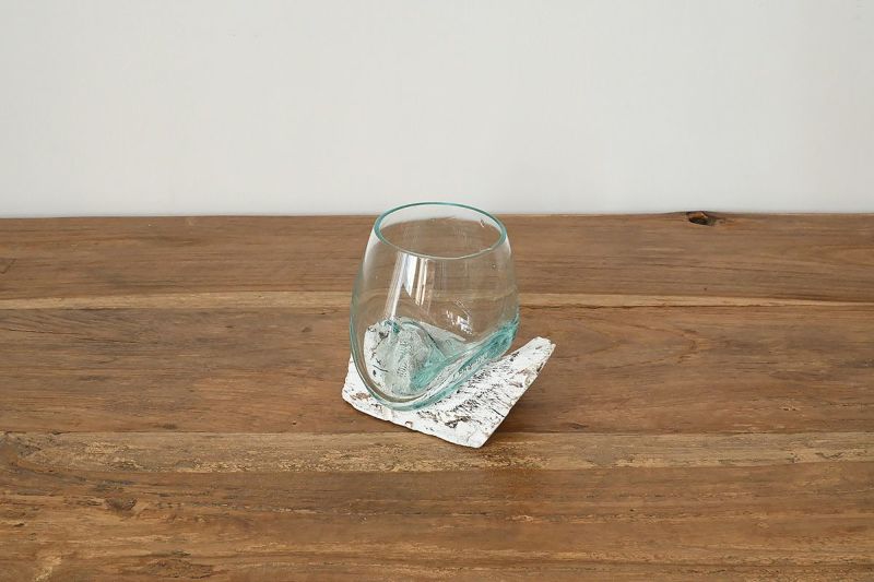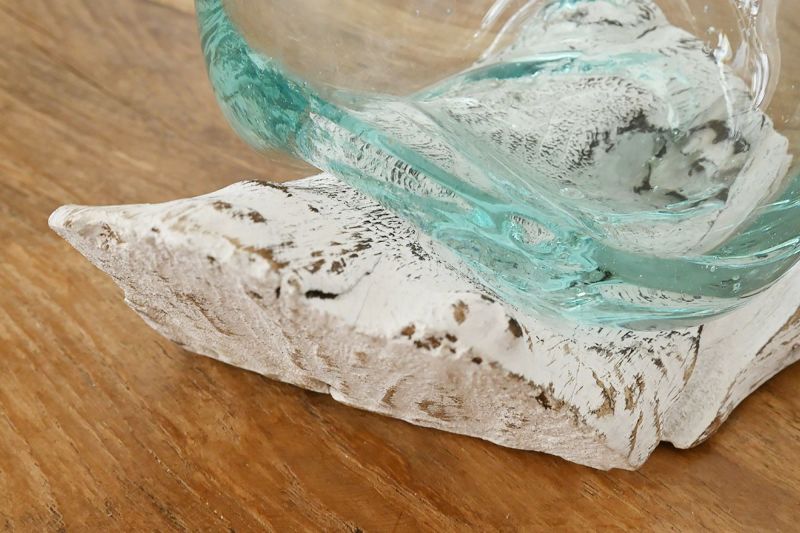 インテリアデコレーションに最適な流木とガラスのベースです。造花を飾って置いておけば、雰囲気のあるディスプレイに。木の実やポプリを入れて飾るのもおすすめです。夏は水を入れて飾れば、涼しげなインテリアに。ほのかに青みを帯びたインドネシアの再生ガラスが流木の風合いとよくあいます。