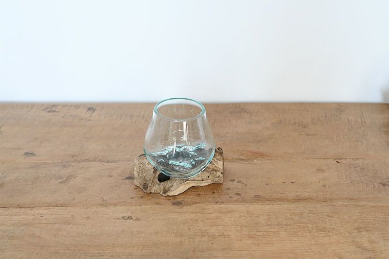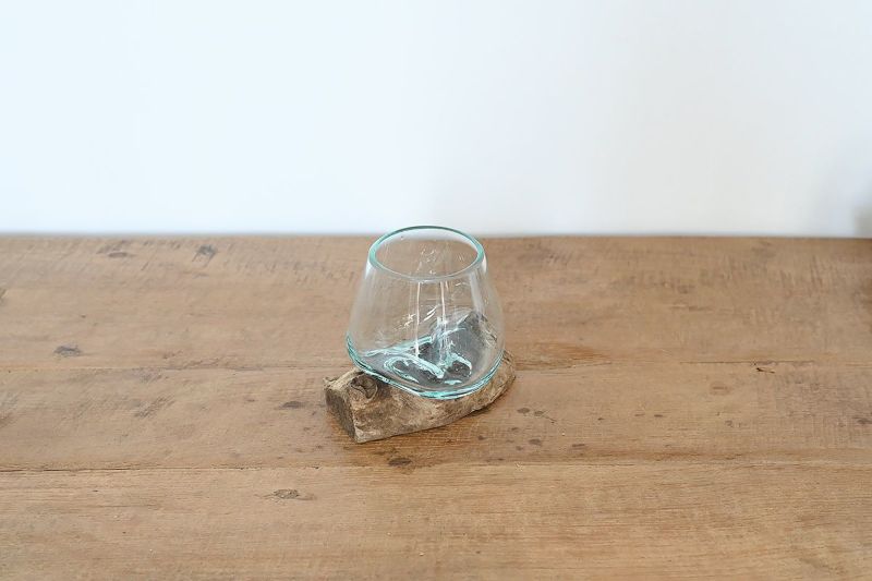 天然の流木にガラスボウルをそのまま当て込んで型取りをした、他にはないユニークなデザインのガラスベースです。 個性的な木の土台は、オブジェのようでもあり、そのまま飾っても、雰囲気のあるインテリアに。 ひとつひとつ形が異なる一点もののアイテムですので、お好みのデコレーションをお楽しみください。