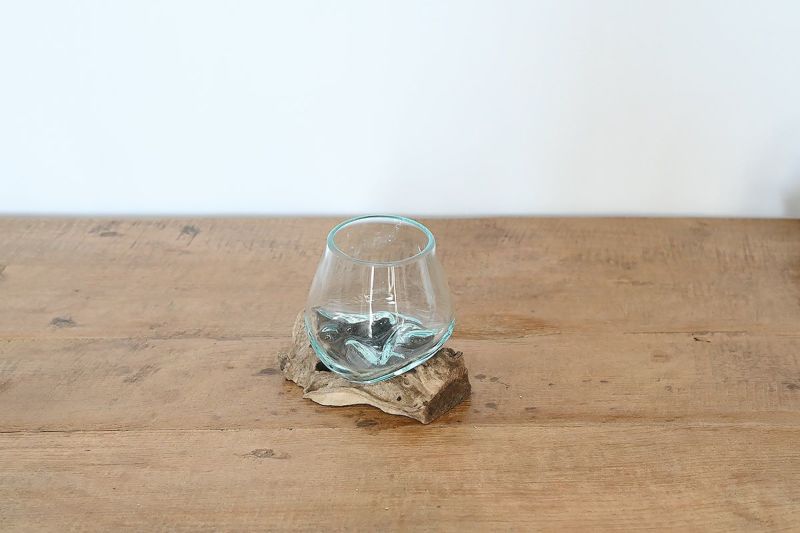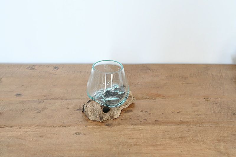 流木にガラスボウルをそのまま当て込んで、型取りをした他にはない独特のかたちのガラスベースです。個性的な木の土台は、オブジェのようでもあり、そのまま飾っても、雰囲気のあるインテリアとして役立ちます。また、見る角度によって、いろいろな表情を見せます。ひとつひとつ形が異なる一点もののアイテムです。