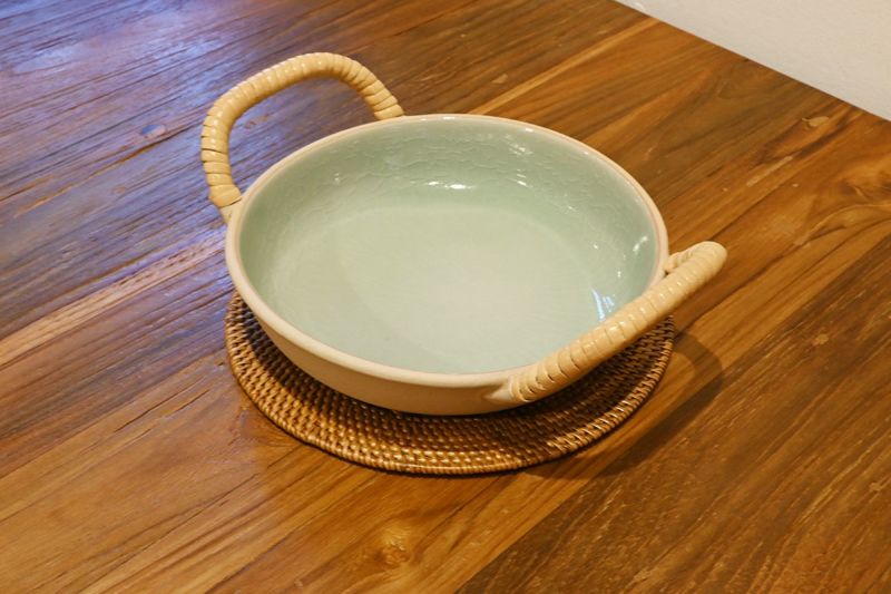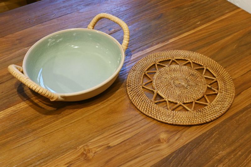 バリ島東部のトゥンガナン村で作られているインドネシアの伝統工芸品です。アタは植物の一種。細く裂いた茎を手で編んでいき、形ができたら太陽の下で天日干しします。その後、防虫のためココナッツの殻などで燻し、こんがり飴色に仕上げます。 仕上がったアタは水洗い可能で、天日干しする事によって、何十年も使えます。 南国の先人の知恵が今の時代にも使い親しまれ、日本の国までやってきました。丈夫な編みはすべてハンドメイドによるものです。