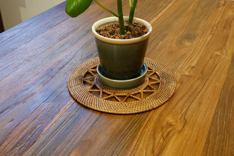 テーブルに敷くだけでなく、壁に飾るとアートのような存在感を発揮します。実用的な機能を持ちながら、インテリアとしても楽しめるので、空間に新しい魅力を加えます。観葉植物やフラワーベースの下に敷けば、そのデザインが引き立ち、ナチュラルでおしゃれな雰囲気を作り出します。