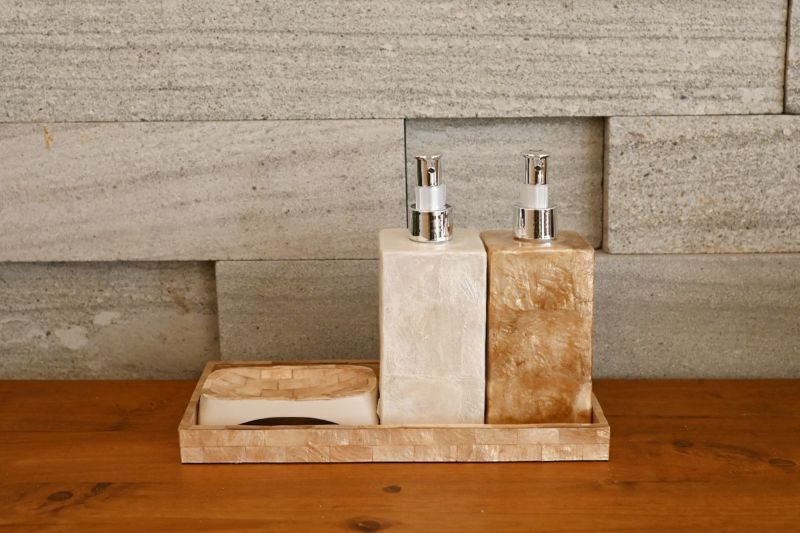 アジアンリゾートではおなじみのシェルを加工したソープディスペンサーです。軽く使いやすいデザイン、シンプルなかたちは、洗面スペースでも場所を取らずにスマートに収まってくれます。中身を入れ替えるだけで、いつもの洗面がすっきり、リゾート空間に。シェルのきらめきがご自宅にリゾート感をプラスしてくれます。