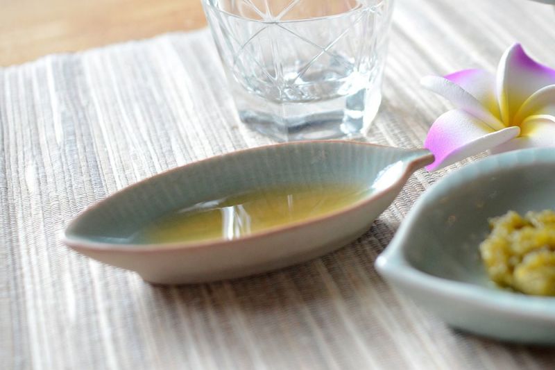 バナナの葉をデザインしたアジアンリゾートにぴったりな豆皿です。お醤油や、調味料、薬味のほか、ちょっとしたおつまみを載せるのも良いですね。裏面と周辺部の素焼き色と、表面のオーシャングリーンのコントラストが、とてもきれいです。重ね合わせ(スタッキング)もできます。