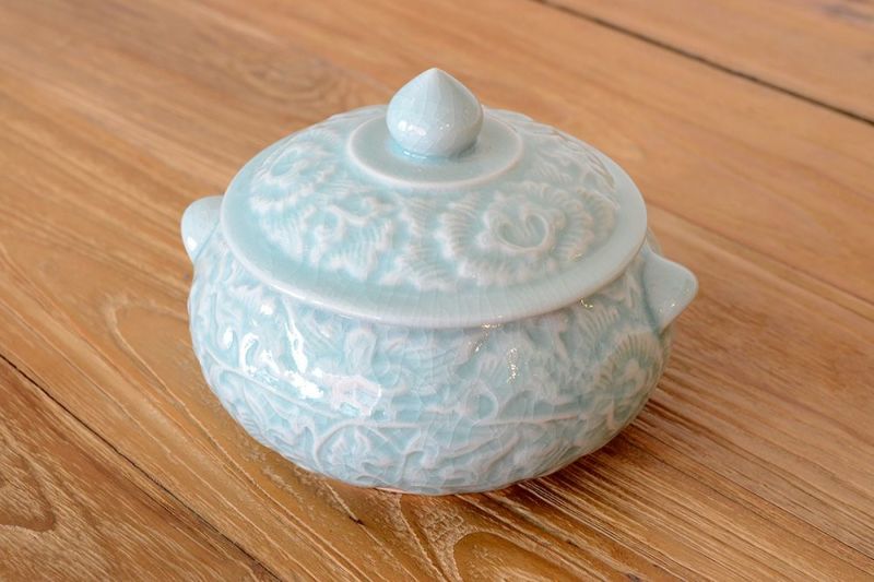 セラドン焼きは、タイの北部に700年前から続く、伝統的な高級青磁器です。タイの土を使い、草木の釉(うわぐすり)をかけて高温で焼いており、すべて天然原料のみで作られています。美しい深みのあるブルーと、繊細なひび(貫入)の模様が特徴です。このひび模様は、焼いたあと冷却することにより器の表面に生まれるものですが、実際の手触りはツルツルとしていて、とても滑らかです。