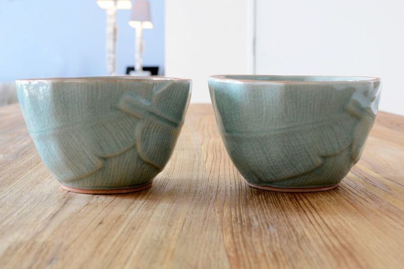 セラドン焼きは、タイの北部に700年前から続く、伝統的な高級青磁器です。タイの土を使い、草木の釉(うわぐすり)をかけて高温で焼いており、すべて天然原料のみで作られています。美しい翡翠のようなグリーンと、繊細なひび(貫入)の模様が特徴です。このひび模様は、焼いたあと冷却することにより器の表面に生まれるものですが、実際の手触りはツルツルとしていて、とても滑らかです。