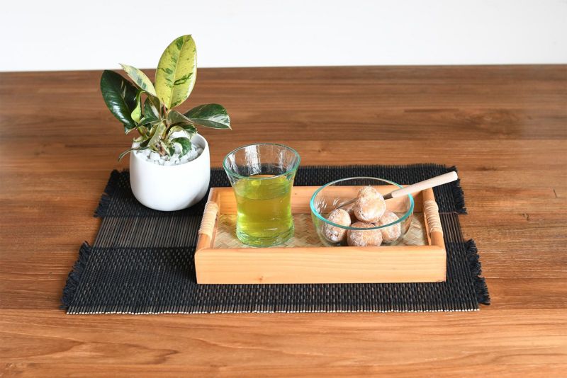 和のテイストにもとても良く合うランチョンマットです。シックな色からカラフルな色まで多彩なカラーバリエーションも魅力的。 くるくると巻いたり、四つ折りにして収納できるのも竹ならではの便利なところです。
