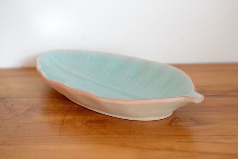 食卓が一気に華やかになるバナナリーフのお皿です。ハンドメイドの温もりが、どことなく安心感を感じさせる仕上がり。タイのリゾートホテルでも使われることのある、美しい翡翠色です。エスニック料理とはもちろん相性抜群ですが、和食に使ってもOK。翡翠色のお皿は茶系の食べ物を美味しく見せてくれます。お料理が楽しくなる一枚です。