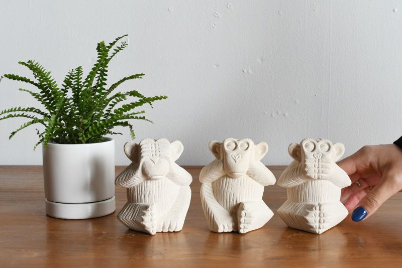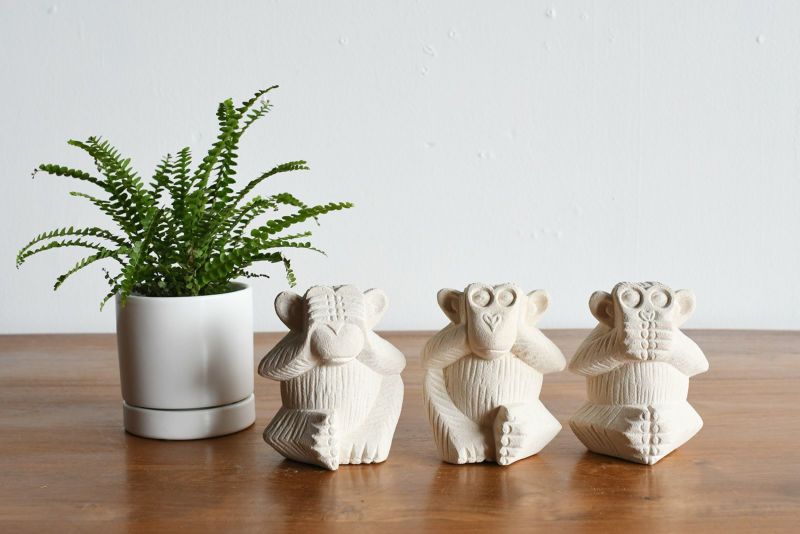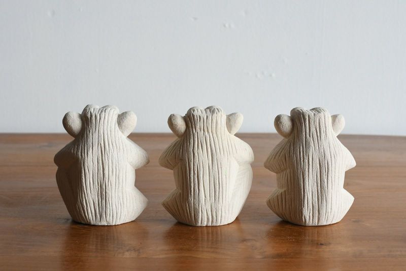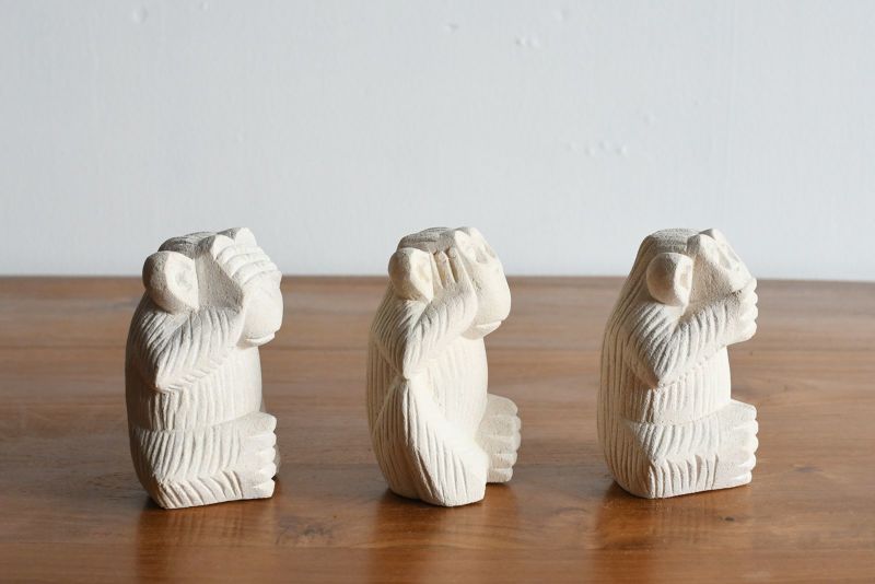 ライムストーンの置物です。手彫りでひとつひとつ彫り出して作られています。卓上ディスプレイに使ったり、玄関先のオブジェにしたり、丸みのある猿のフォルムと和やかな表情に癒されます。 「見ざる 聞かざる 言わざる」は、実は古来より世界で見られる表現です。悪いもの・心を惑わすもの・他人の欠点は、見ない・言わない・聞かないに越したことはない、という意味です。