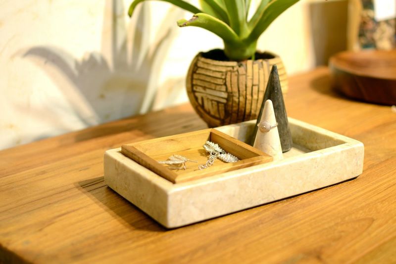 毎日の暮らしにちょっとした贅沢をプラスする、天然石のスクエアトレイ。お気に入りのアクセサリーや時計を置くだけで高級感が出ます。さらに、取り外し可能な木製トレーが付いているため、散らばりやすいピアスなどの小物を入れても取り出しやすい仕様です。