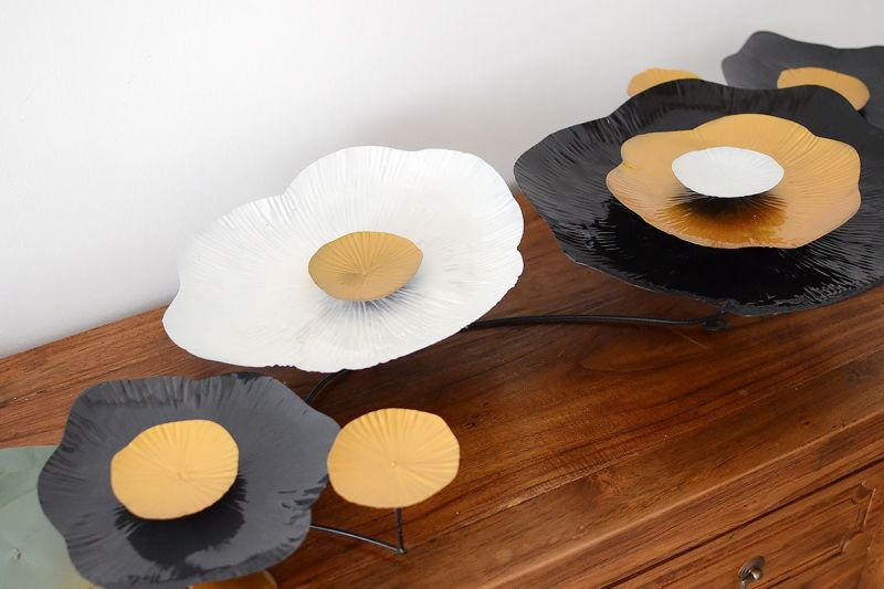 花柄をモチーフにした優美な曲線が、硬質なアイアンの素材感と絶妙にマッチ。ホワイトとブラックのコントラストが、モダンで洗練された印象を与え、さまざまなインテリアスタイルに適応します。