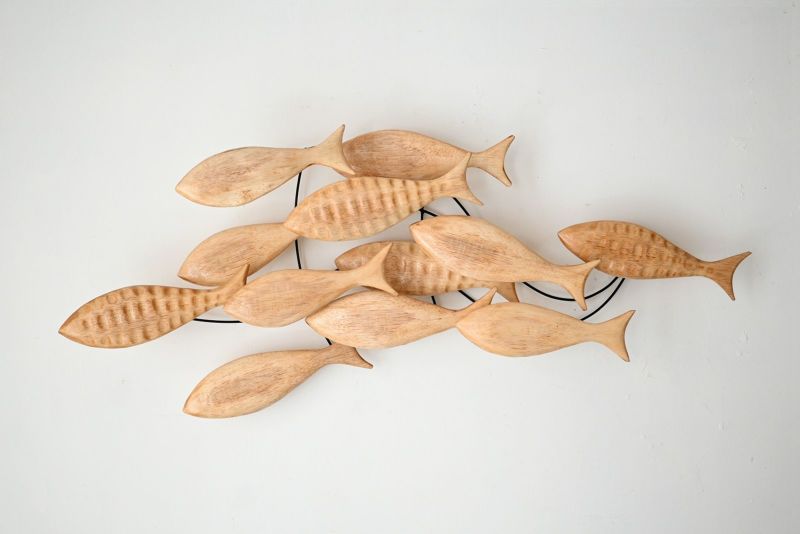 木製の魚が群れをなして泳ぐ、ユニークで遊び心のある壁掛けオブジェです。壁にひとつ飾るだけで、いつものリビングに優しい雰囲気をもたらします。