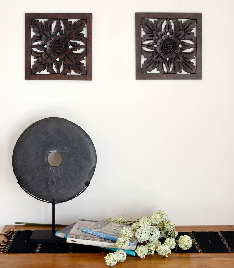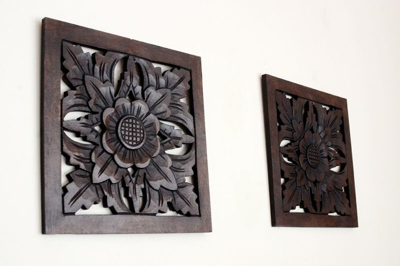 重さがないので、手軽に付けられるウッドレリーフです。バランスの取りやすい正方形、お花のモチーフはアジアン家具との相性も抜群で、リゾートのような癒しの空間作りにおすすめです。空いている空間に並べて飾るだけで華やかな空間に。インテリアデコレーションとして取り入れやすいアイテムです。