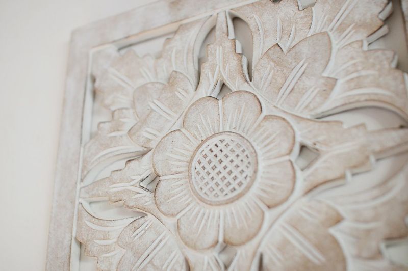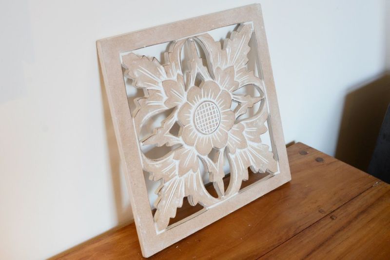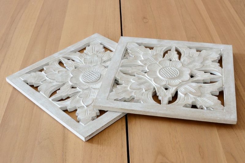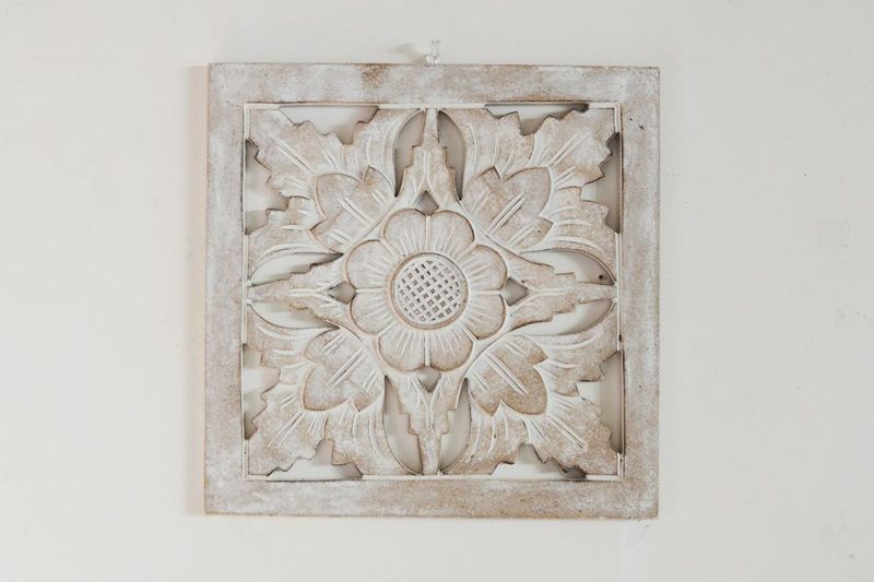重さがないので、手軽に付けられるウッドレリーフ。何枚か並べて付けるのもおすすめです。バランスの取りやすい正方形、お花のレリーフがリゾートのような癒しの空間にぴったりです。取り入れやすいホワイトウォッシュ加工。アジアンのみならず幅広いスタイルに合わせられます。