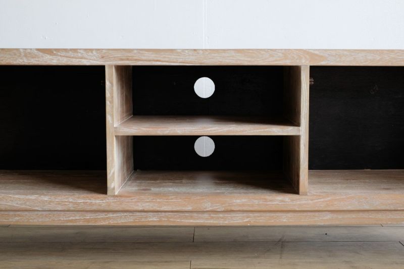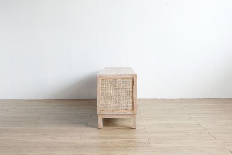 ラタンと天然木の組み合わせが優しいナチュラルな印象を与えてくれるテレビボード。扉部分と、側面にもラタンがあしらわれているので見た目もスマート。ラタンの扉は通気性が良いので、中に熱や空気がこもらないのも魅力のひとつです。ラタンの扉部分は赤外線を通すので、閉めた状態でもリモコン操作が可能です。フレンチカントリーにもよくあう、ホワイトウォッシュのカラー。ナチュラルテイストなお部屋にぴったりです。あたたかみのあるデザインがお部屋全体をやわらかい雰囲気で包みます。