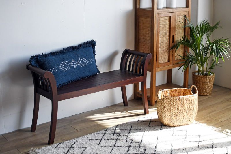 もちろん単品でお部屋に置いて、ひと休み用に使うのもおすすめです。ベッドルームでちょっと腰を掛けるほかに、荷物置きとしても役立ちます。端の持ち上がったアーム部分は立ち上がるときに、掴むのにちょうどよく、アーム付きのベンチとして、あらゆるシーンで役立ちます。