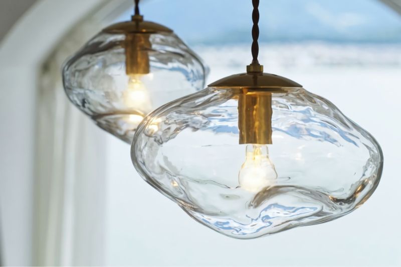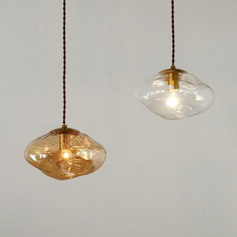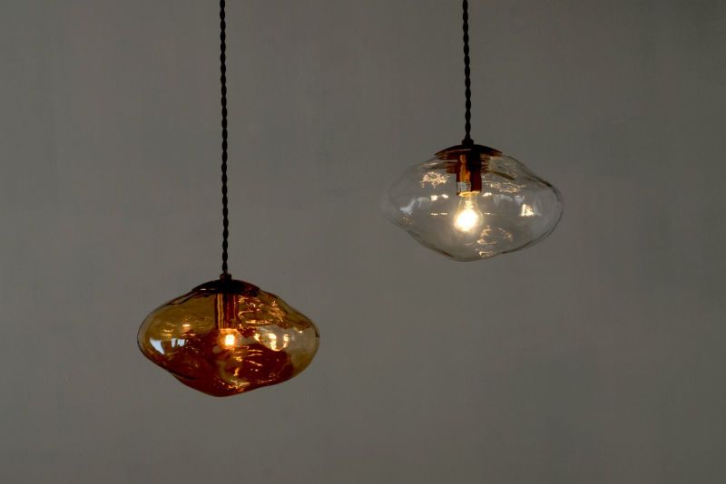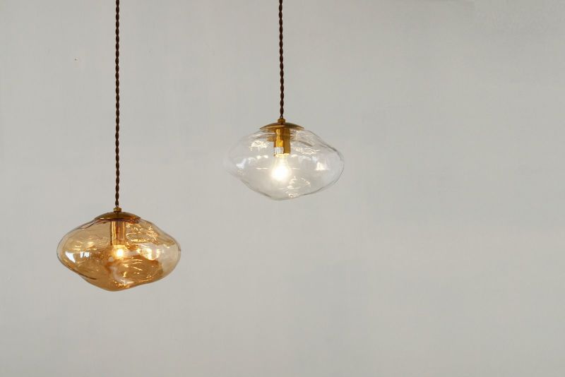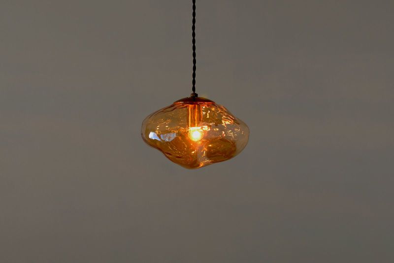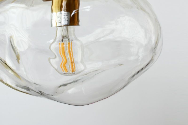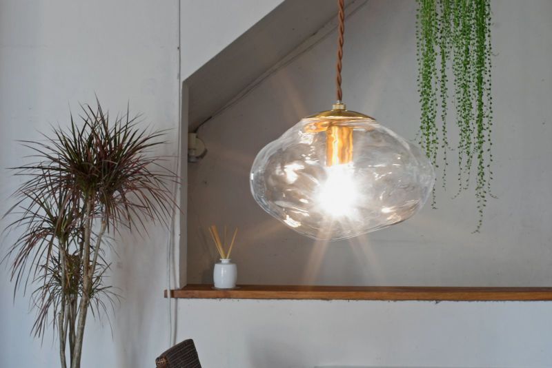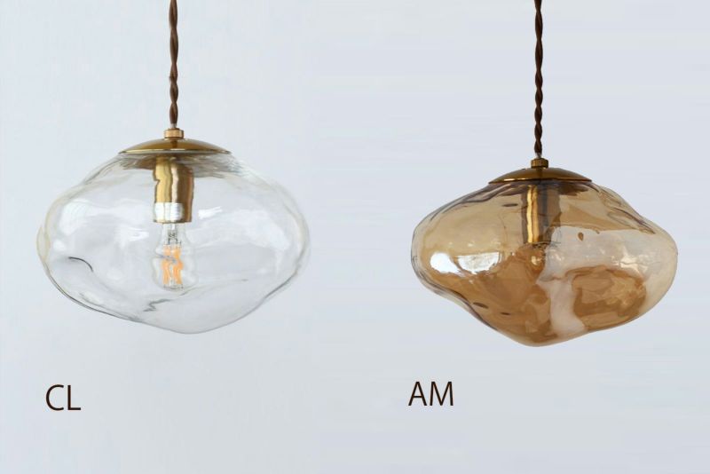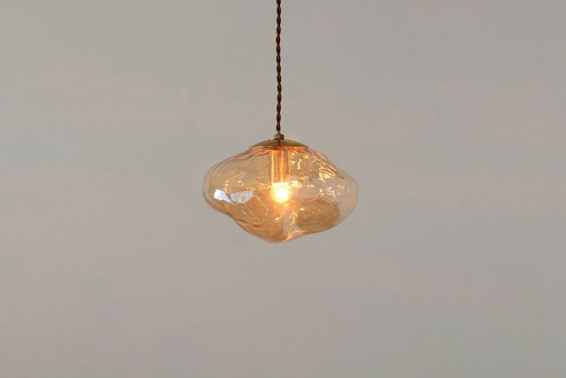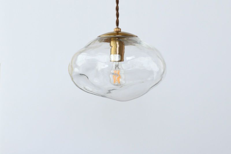 うねるような、波打つようなゆらぎのあるガラスのペンダントランプです。見る角度により微妙に変化するフォルムにこだわりました。 空に浮かぶ雲からインスピレーションを受けたデザインです。 でこぼこしたフォルムと厚めのガラスの組み合わせが、水中を思わせる美しい影を広げます。