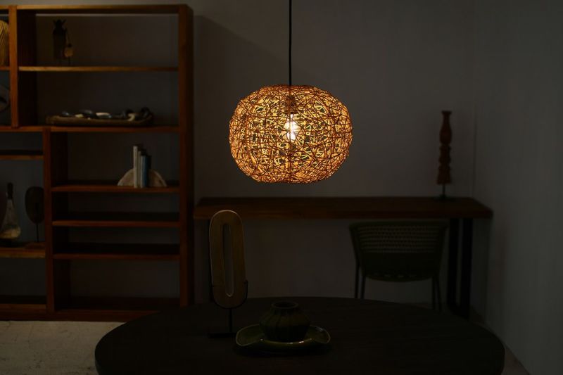 シェードの編み目から空間全体に光が広がり、その陰影がとてもきれいです。職人の手作業でひとつひとつ丁寧に作られるシェードは、ハンドメイドのぬくもりを感じさせる仕上がりです。癒しの空間にぴったりなやわらかな光を堪能いただけます。