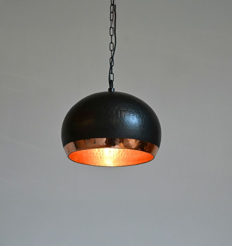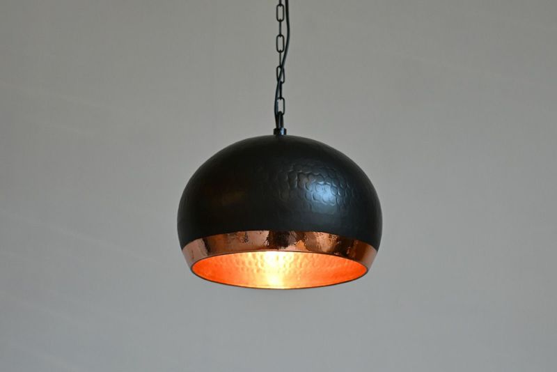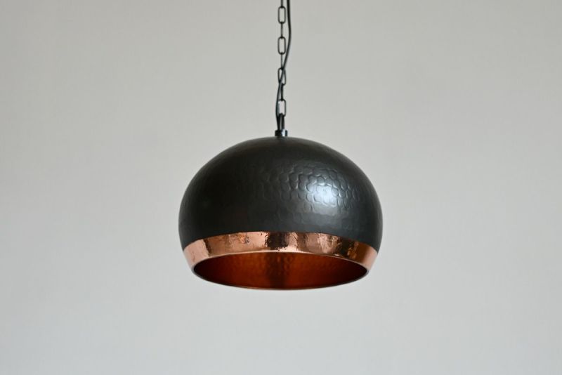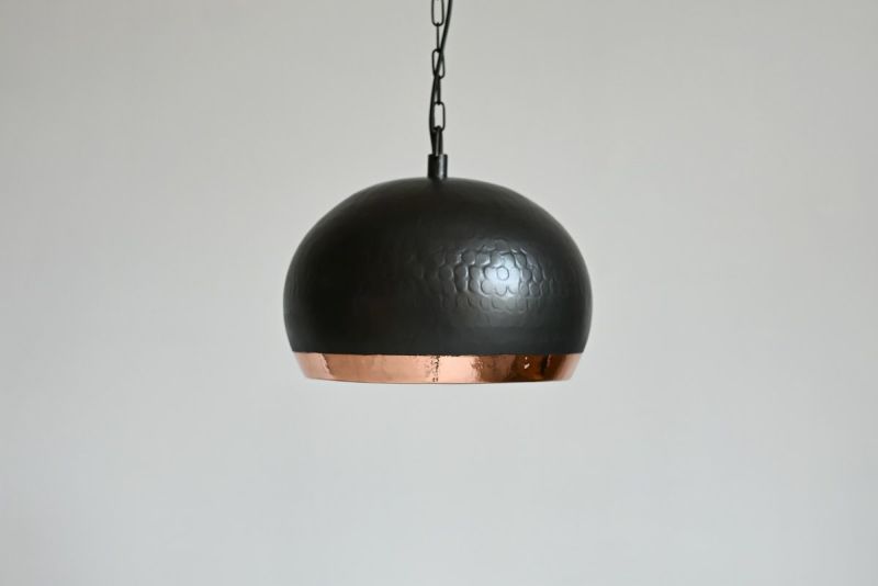 外側はマットブラックでシックに仕上げられ、内側には艶やかな銅色が施されたこのペンダントランプ。落ち着いた大人のインテリアにぴったりで、灯りをともせば穏やかなオレンジ色が広がり、心安らぐ空間を演出します。
