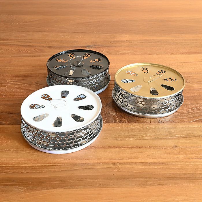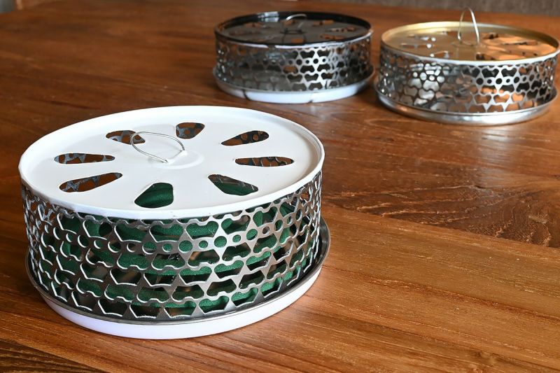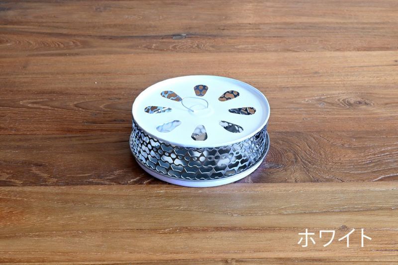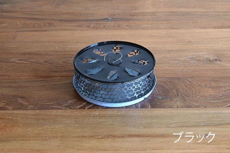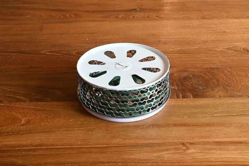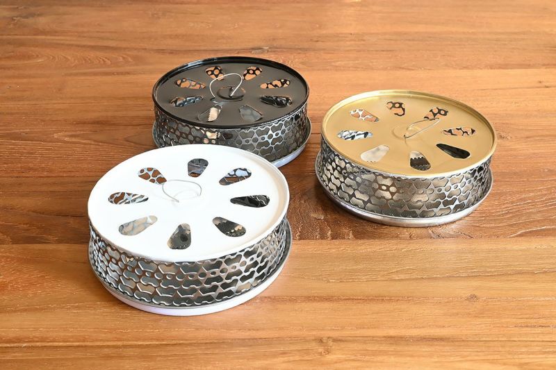 使い捨ての缶をリサイクルして作られた、環境に優しいエコな蚊取り線香ホルダー「リサイクル蚊やり」。 シンプルな単色カラーでまとめられたデザインは、モダンなインテリアにも自然に溶け込み、置き場所を選びません。 モノトーンのカラーリングが、他のアイテムとの相性も良く、さりげなくオシャレな空間を演出してくれます。