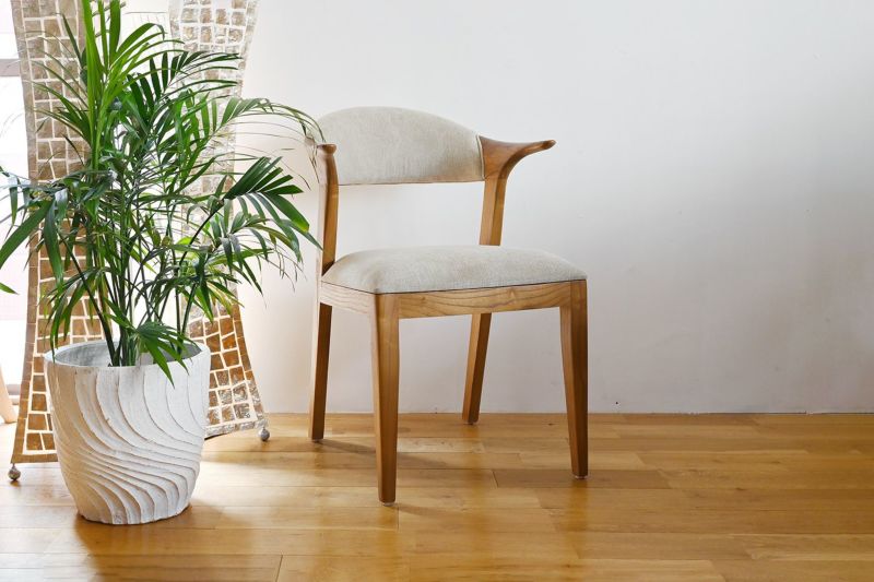 通常のアームチェアより短めのアームを持たせたセミアームチェア。短めのアームはダイニングテーブルに合わせやすい上、肘掛けがあることで、よりゆったりと座ることができます。アームチェアに比べて、出入りのしやすさもあり、見た目もすっきりと圧迫感を抑えられます。ナチュラルなカラーの組み合わせが素朴でやさしい雰囲気を作り上げ、緩やかなカーブがしっかりと背中を受け止めてくれます。