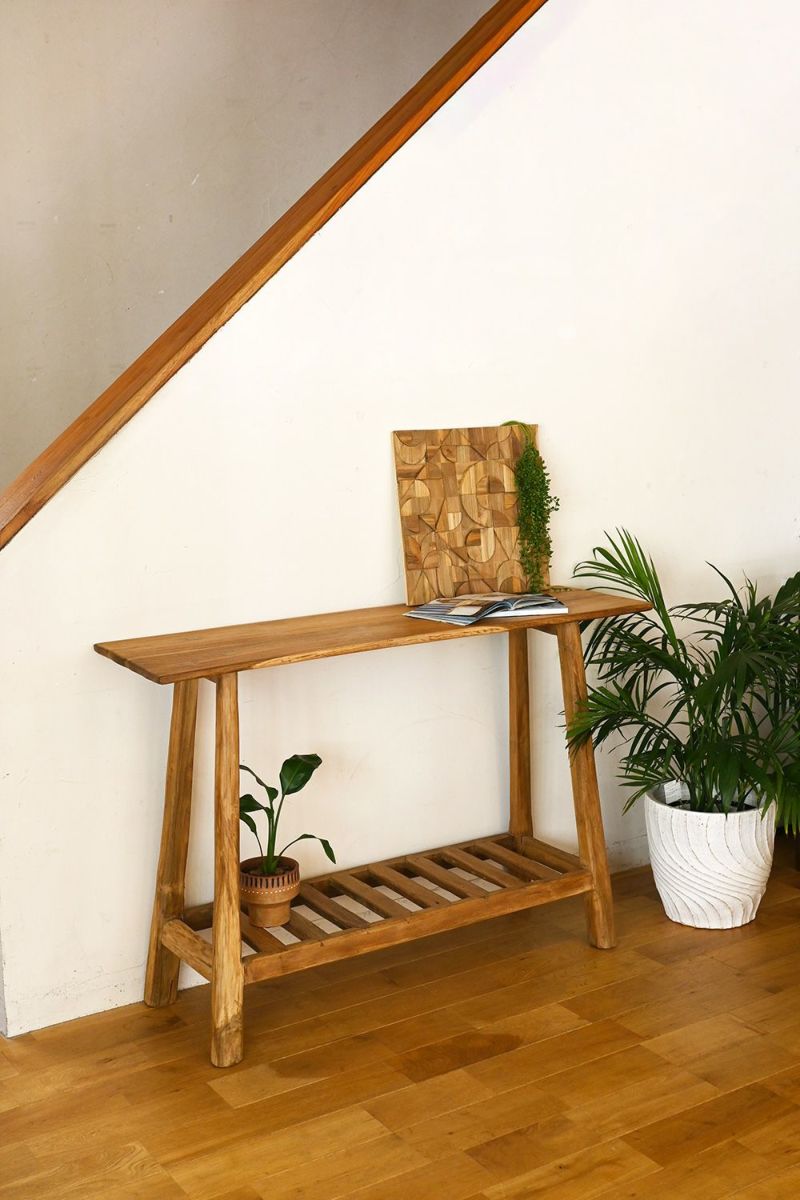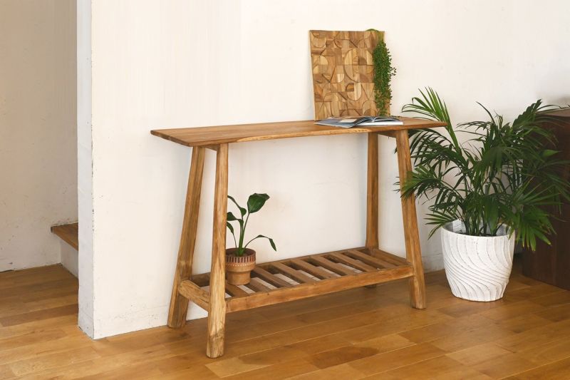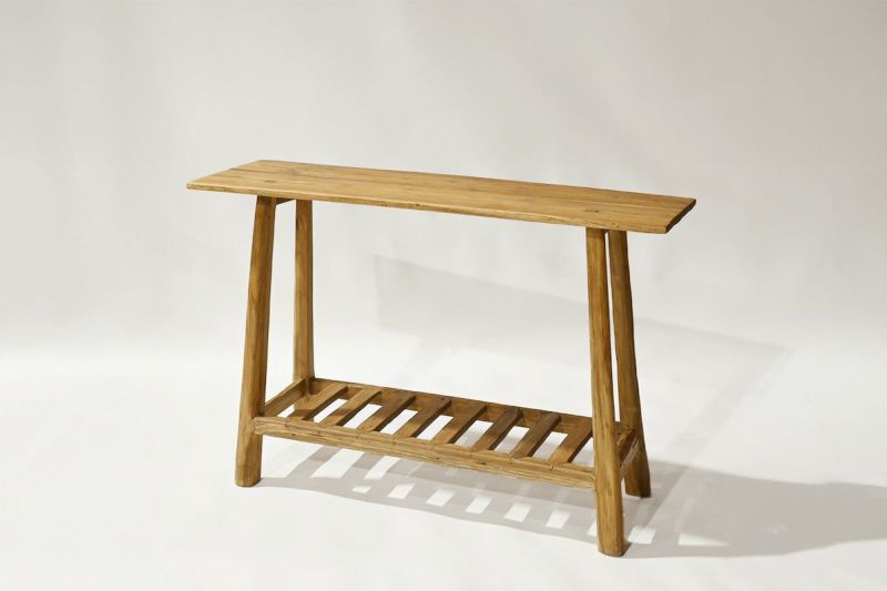 チーク古材が持つ豊かな風合いを活かした、温もり感じるコンソールテーブル。長い年月を経た木ならではの節や色ムラが、ひとつひとつに異なる個性を与えます。傾斜がついた緩やかな脚のライン、ラフなその形状も特徴的。無駄を省いたシンプルなフォルムは、空間にすっきりとした印象を与え、玄関やリビングルームなど、さまざまな場所で活躍します。