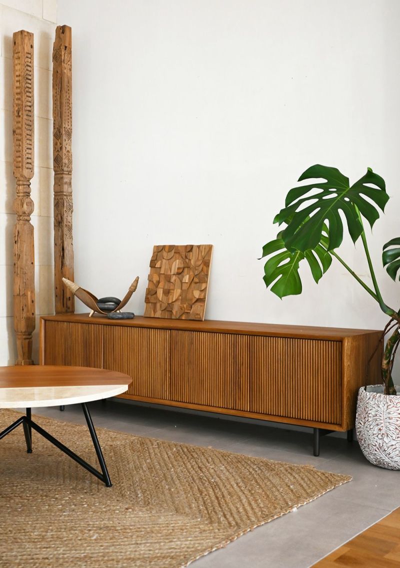 ルーバーデザインのすっきりとしたローボード。チーク材を使用し温もりある天然木の雰囲気はそのままに、直線ラインが並ぶスタイリッシュなデザインです。モダンなインテリアとも相性よく、優美な印象を与えます。脚は黒いスチール製。チーク材の素材感を引き立てます。