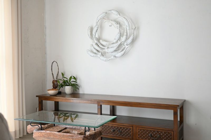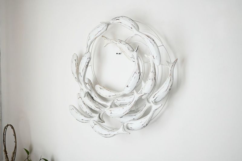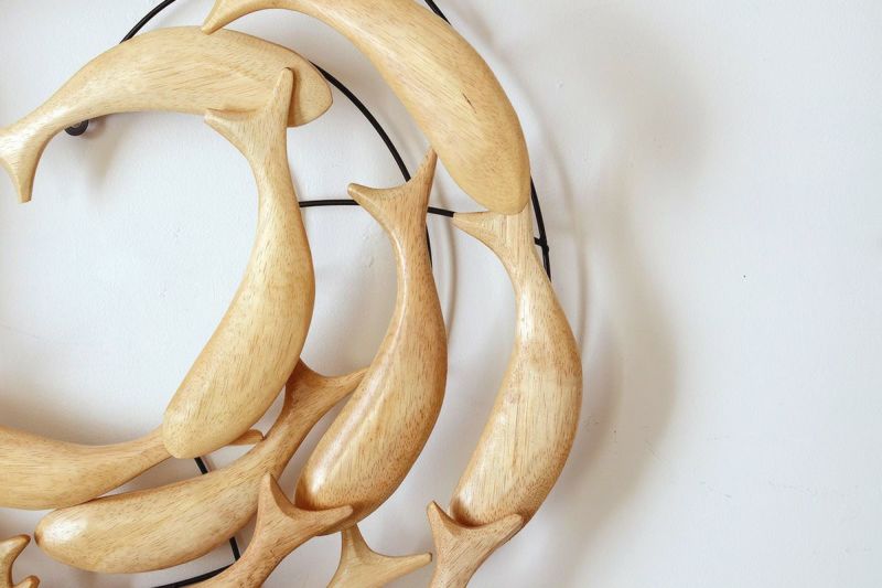 木製の魚が渦を巻いて泳ぐ、ユニークで遊び心のある壁掛けのオブジェです。いつものリビングに楽しげな雰囲気をプラスしてくれます。 ちょっとしたスペースに飾ることができる嬉しいサイズ感です。