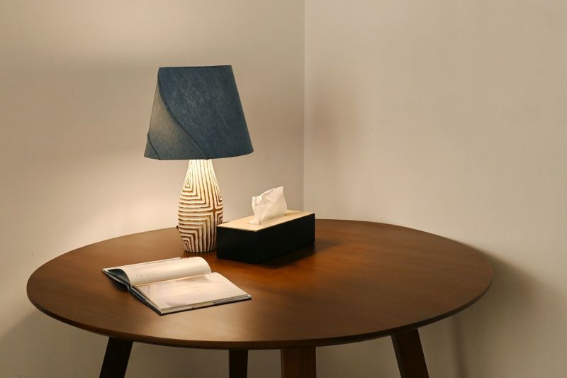 デニム生地をシェードにした個性あるテーブルランプ。土台のウッドベースには上品な彫りのデザインが施され、青と白の爽やかな組み合わせでインテリアのアクセントにぴったりです。カジュアルな空間にもシックな空間にも馴染みやすく、お部屋のインテリアを引き上げてくれます。