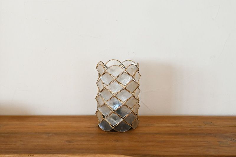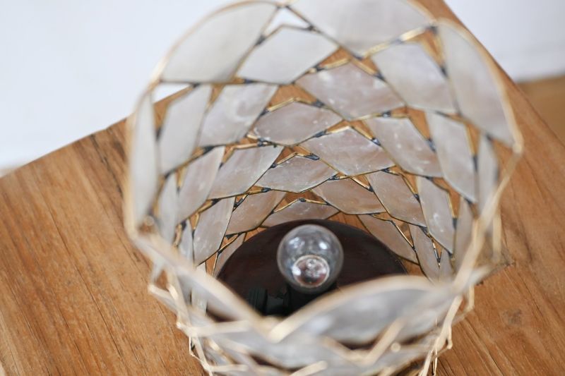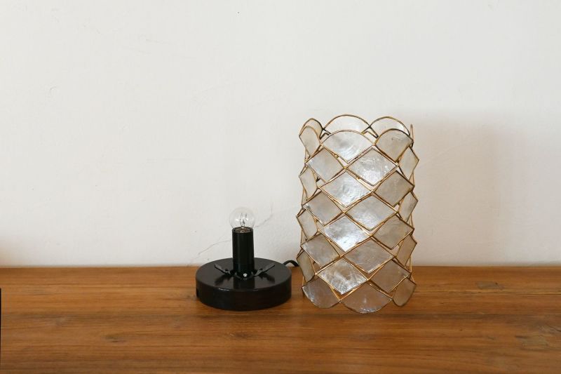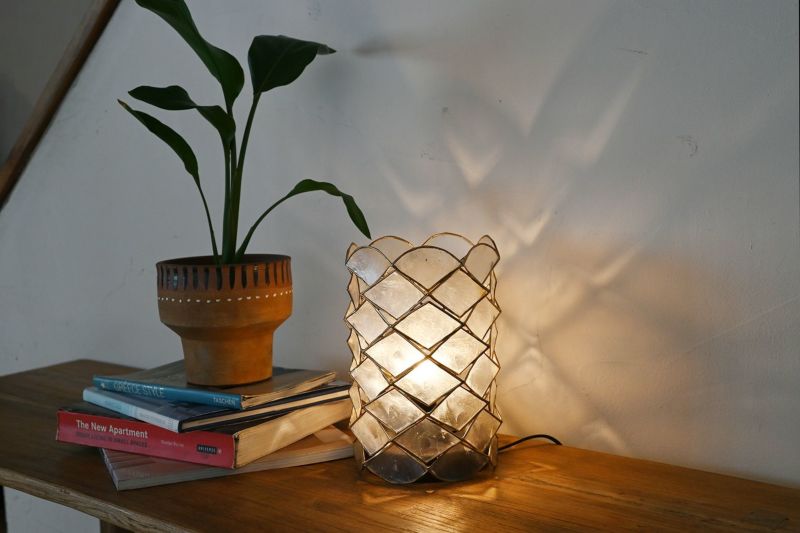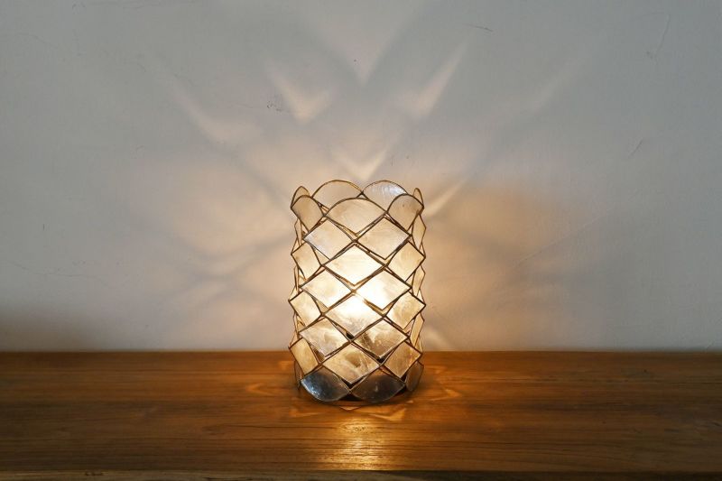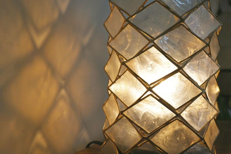 ダイヤ型と扇型に加工したカピスシェルを組み合わせたシェードのテーブルランプ。シェルのほどよい透明感を活かしてシェードに仕立てました。自然素材ならではの上品さ、可憐さが感じられ、シェードを通した光の陰影がダイヤ型に広がり、空間を印象付けます。