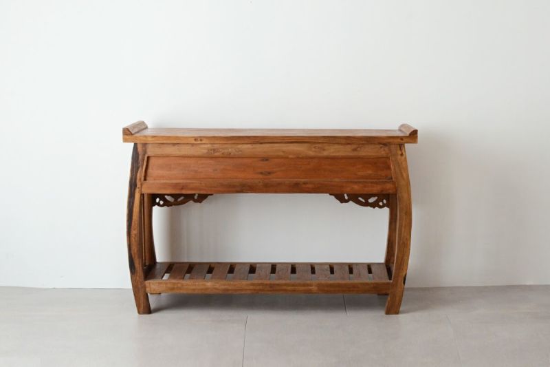 風合いあるレリーフのコンソールテーブルです。棚板がついているので、天板の下にものを飾ったり、置いたりできます。風合いのあるレリーフが魅力的で他にはないオリジナリティがあります。古材ならではの独特の質感と華やかなレリーフが、印象的なシーンを演出してくれます。飾り棚として、ランプやオブジェを置いて空間演出にするのもおすすめです。エントランス、玄関ホールや長い廊下の最奥、踊り場などに。