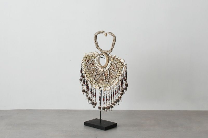 貝殻の宝石や身体装飾品で知られるパプアニューギニアの人々の様々な伝統的な儀式で使用され続けている首飾りをモチーフに作られたオブジェです。 ネックレスは、全てハンドメイド。ロープの裏地に織り込まれたさまざまな種類の貝殻を使用して、一つ一つ丁寧に作られています。