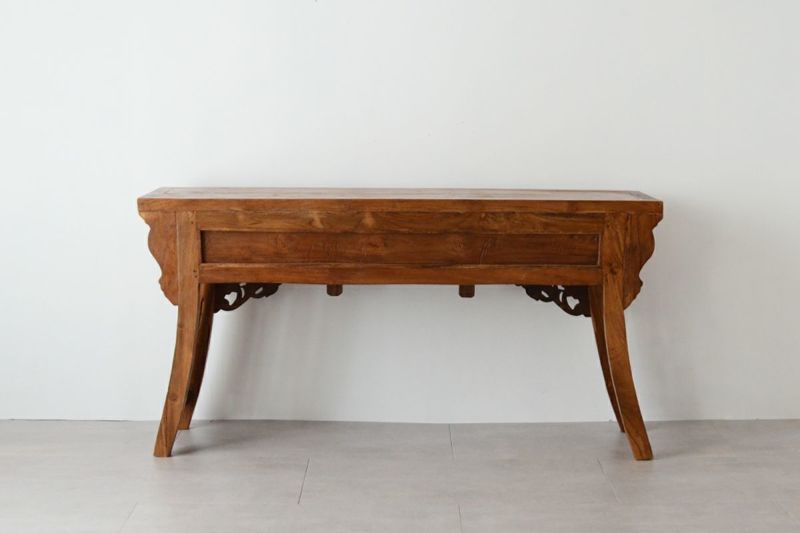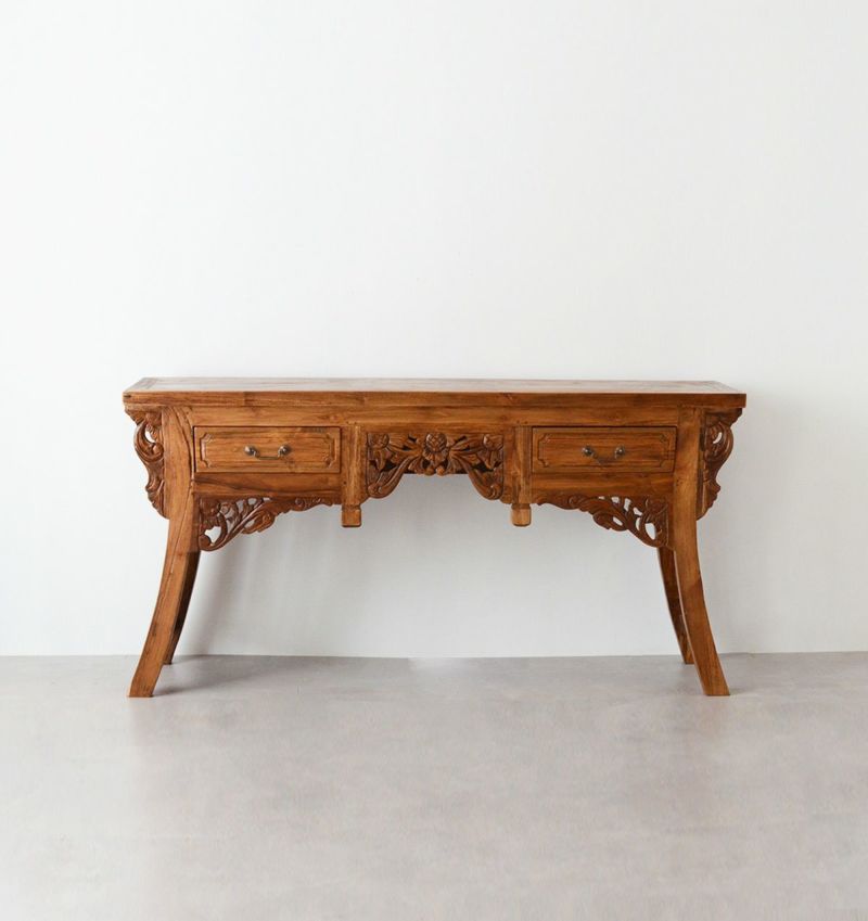 古材の雰囲気を活かしてリプロダクトされたコンソールテーブルです。風合いのあるレリーフが魅力的で他にはないオリジナリティがあります。古材ならではの独特の質感がよく出ていて、お部屋の中で印象的なシーンを演出してくれます。飾り棚として、ランプやオブジェを置いて空間演出にするのもよし。エントランスや待合室に置くのもおすすめです。お部屋の中では、デスクは必要ないけどちょっとした作業場がほしいときなど、さっとノートPCを広げて簡易デスクとして使用することも可能です。真ん中のレリーフの左右は引き出しになっています。