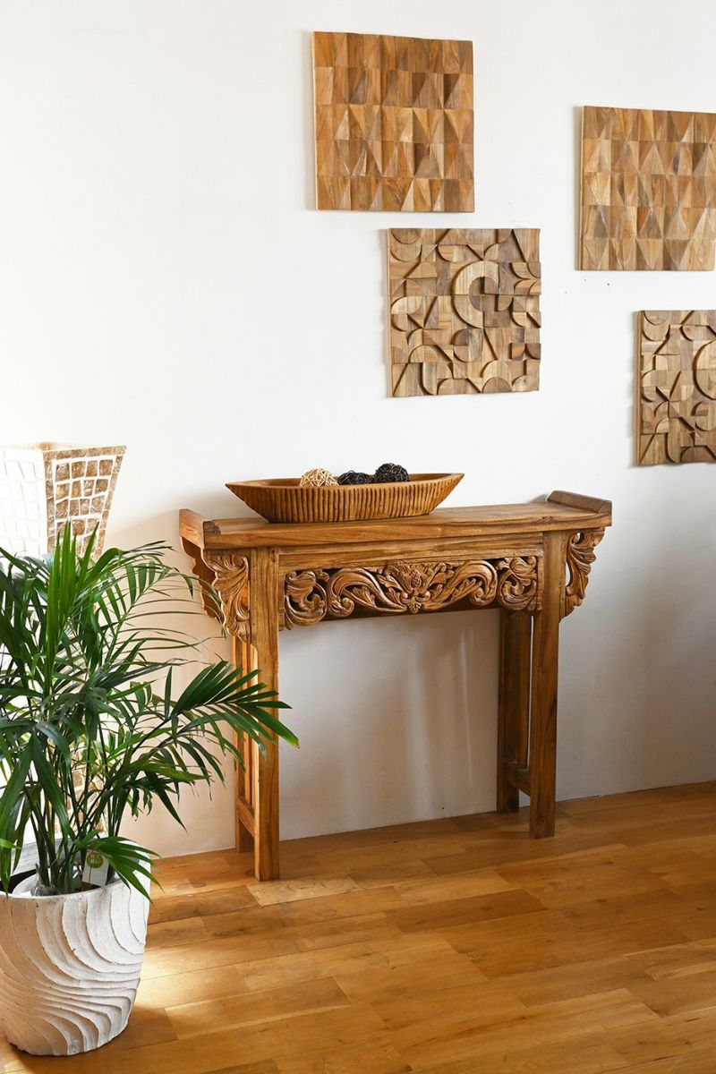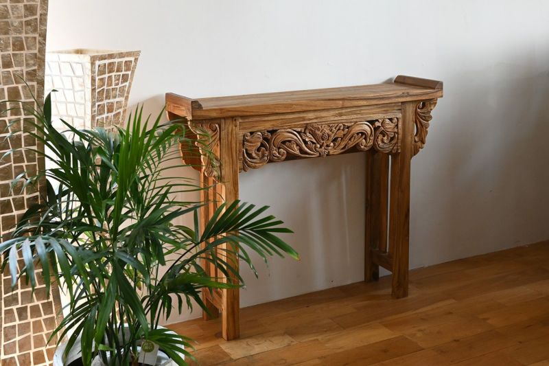 古材の雰囲気を活かして製作されたインドネシアのコンソールテーブルです。前面に施されたレリーフが他にはないオリジナリティを感じさせます。古材ならではの独特の質感がよく出ています。奥行きのないコンパクトなサイズなので、取り入れやすく、飾り棚としてランプやオブジェを置いて空間演出をするのに向いています。エントランスやリビングルームにおすすめです。