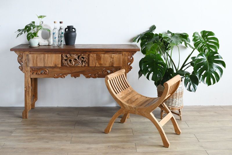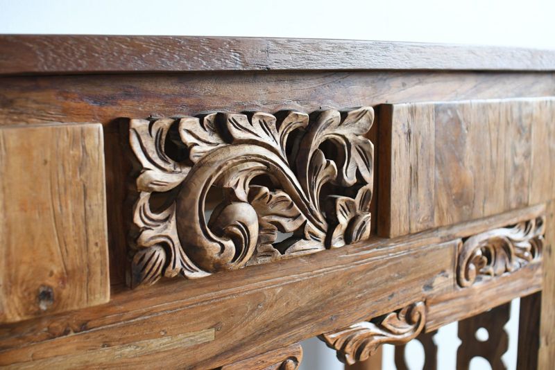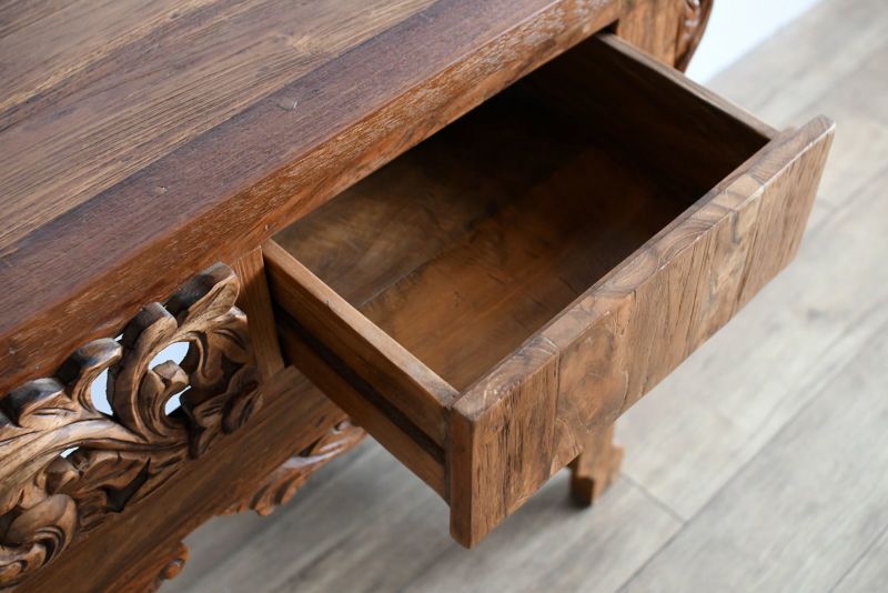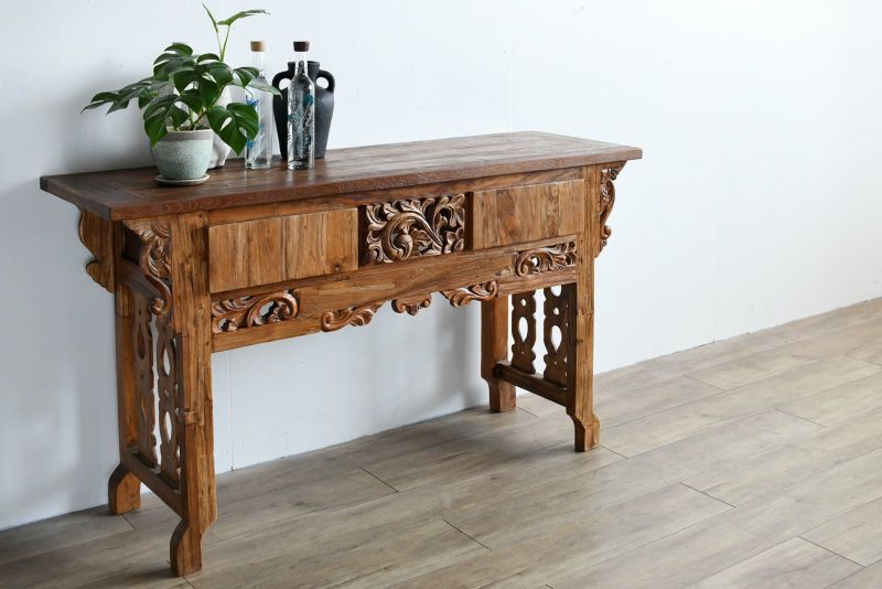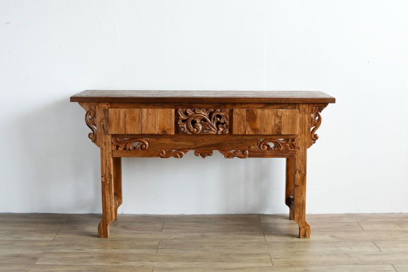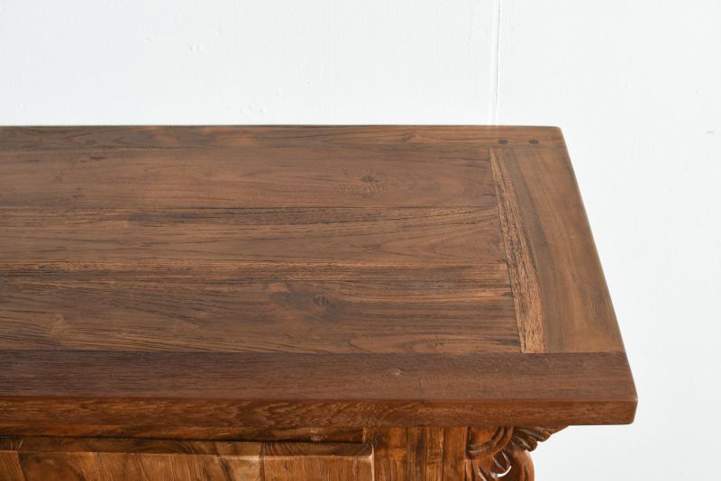 古材の雰囲気を活かしてリプロダクトされたコンソールテーブルです。風合いのあるレリーフが魅力的で他にはないオリジナリティがあります。古材ならではの独特の質感がよく出ていて、お部屋の中で印象的なシーンを演出してくれます。飾り棚として、ランプやオブジェを置いて空間演出にするのもよし。真ん中のレリーフの左右は引き出しになっています。ダイニングルームやリビングルームに取り入れれば、インテリア空間のメリハリにもなります。収納はそこまで必要ないけど空間的に何か置きたいといった場面にもおすすめです。随所に施された職人による手彫りのレリーフが魅力です。