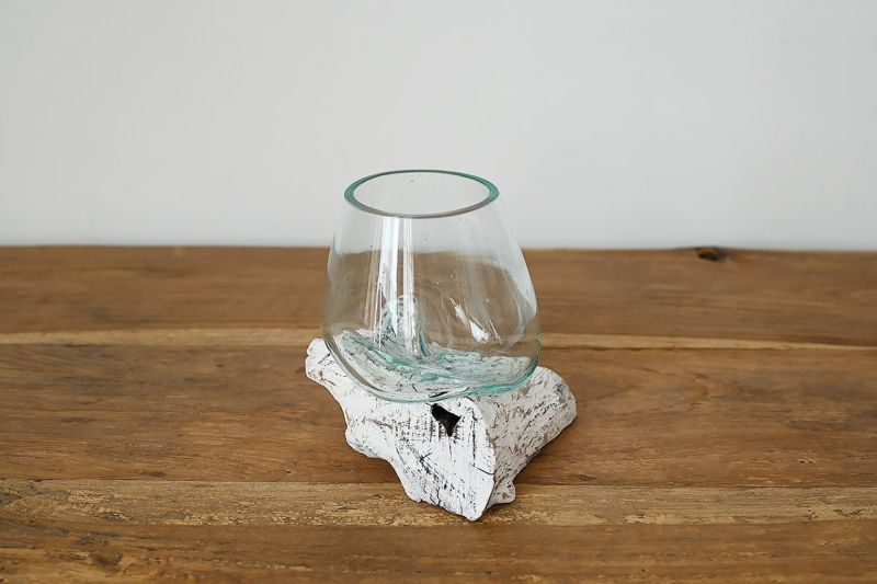 天然の流木にガラスボウルをそのまま当て込んで型取りをした、他にはないユニークなデザインのガラスベースです。 個性的な木の土台は、オブジェのようでもあり、そのまま飾っても、雰囲気のあるインテリアに。 ひとつひとつ形が異なる一点もののアイテムですので、お好みのデコレーションをお楽しみください。