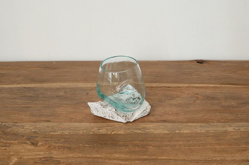 インテリアデコレーションに最適な流木とガラスのベースです。造花を飾って置いておけば、雰囲気のあるディスプレイに。木の実やポプリを入れて飾るのもおすすめです。夏は水を入れて飾れば、涼しげなインテリアに。ほのかに青みを帯びたインドネシアの再生ガラスが流木の風合いとよくあいます。