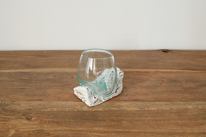 天然の流木にガラスボウルをそのまま当て込んで型取りをした、他にはないユニークなデザインのガラスベースです。 個性的な木の土台は、オブジェのようでもあり、そのまま飾っても、雰囲気のあるインテリアに。 ひとつひとつ形が異なる一点もののアイテムですので、お好みのデコレーションをお楽しみください。