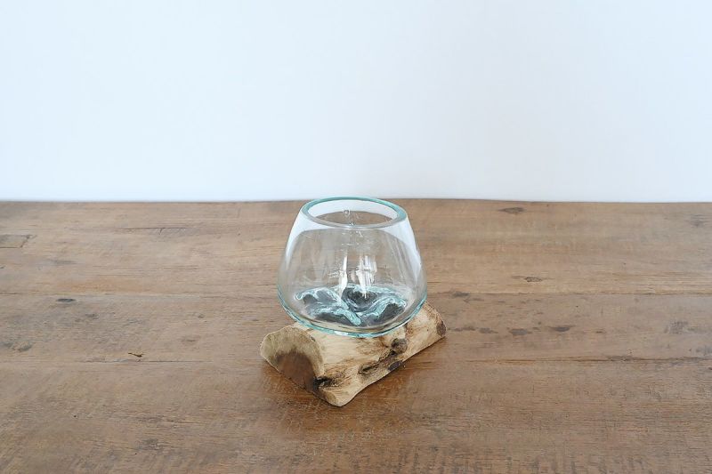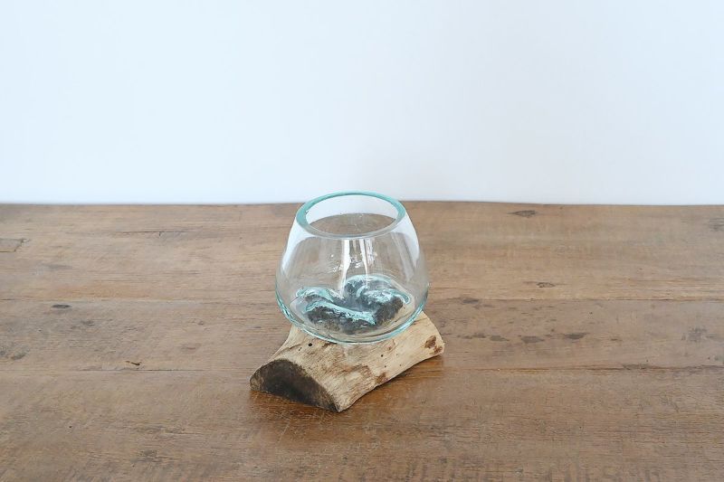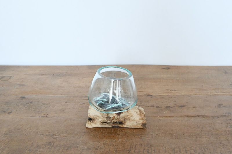 流木にガラスボウルをそのまま当て込んで、型取りをした他にはない独特のかたちのガラスベースです。個性的な木の土台は、オブジェのようでもあり、そのまま飾っても、雰囲気のあるインテリアとして役立ちます。また、見る角度によって、いろいろな表情を見せます。ひとつひとつ形が異なる一点もののアイテムです。