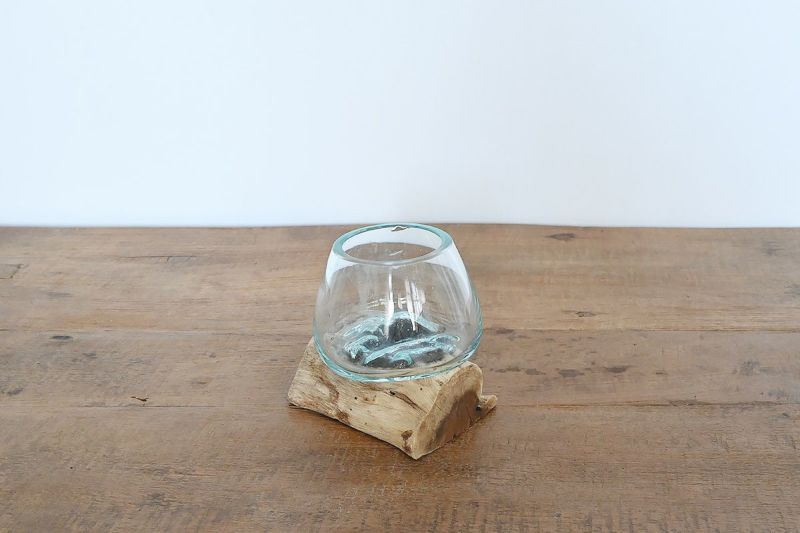 天然の流木にガラスボウルをそのまま当て込んで型取りをした、他にはないユニークなデザインのガラスベースです。 個性的な木の土台は、オブジェのようでもあり、そのまま飾っても、雰囲気のあるインテリアに。 ひとつひとつ形が異なる一点もののアイテムですので、お好みのデコレーションをお楽しみください。