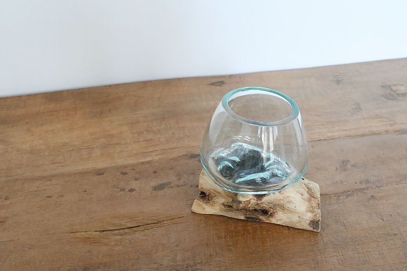 インテリアデコレーションに最適な流木とガラスのベースです。造花を飾って置いておけば、雰囲気のあるディスプレイに。木の実やポプリを入れて飾るのもおすすめです。夏は水を入れて飾れば、涼しげなインテリアに。ほのかに青みを帯びたインドネシアの再生ガラスが流木の風合いとよくあいます。