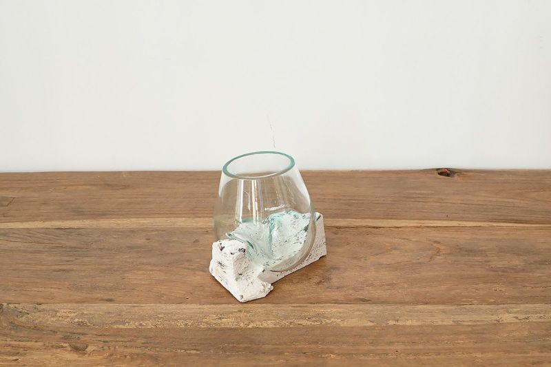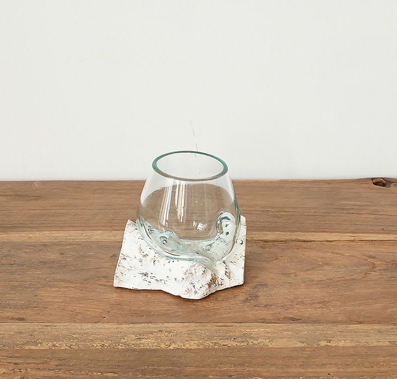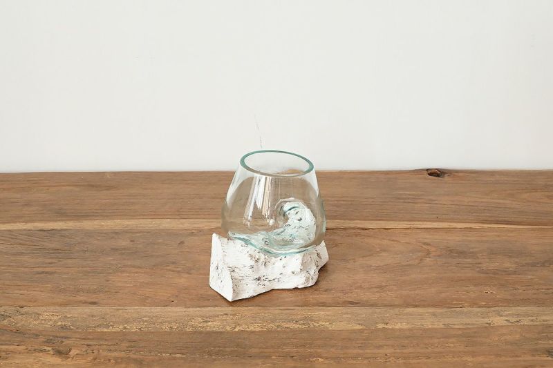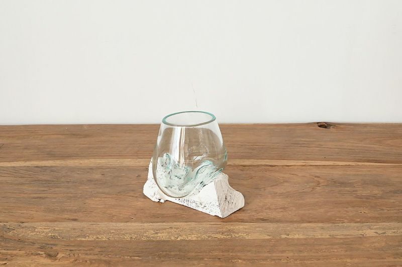 インテリアデコレーションに最適な流木とガラスのベースです。造花を飾って置いておけば、雰囲気のあるディスプレイに。木の実やポプリを入れて飾るのもおすすめです。夏は水を入れて飾れば、涼しげなインテリアに。ほのかに青みを帯びたインドネシアの再生ガラスが流木の風合いとよくあいます。