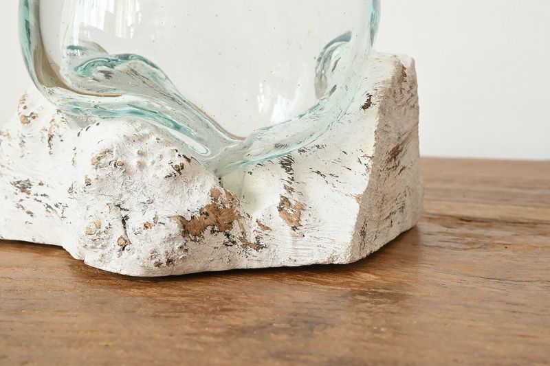 天然の流木にガラスボウルをそのまま当て込んで型取りをした、他にはないユニークなデザインのガラスベースです。 個性的な木の土台は、オブジェのようでもあり、そのまま飾っても、雰囲気のあるインテリアに。 ひとつひとつ形が異なる一点もののアイテムですので、お好みのデコレーションをお楽しみください。