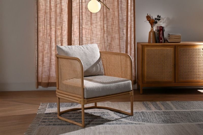 天然素材のラタンで作られた、ナチュラルな風合いが魅力のパーソナルチェア。 ラタンは強さとしなやかな柔軟性を兼ね備えた、家具として最高の特長を持った素材です。 そんなラタンを使い、フレームから編み部分に至るまで、職人が手間隙をかけて、1つ1つしっかりと作っているので、丈夫で安定感のあるつくりです。 天然素材の持つあたたかみに触れて、ゆったりとした優雅な時間を過ごしいただけます。