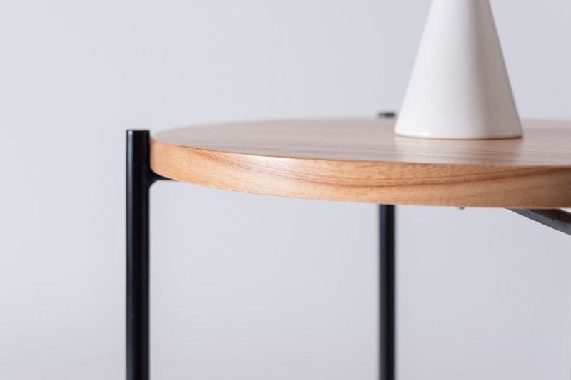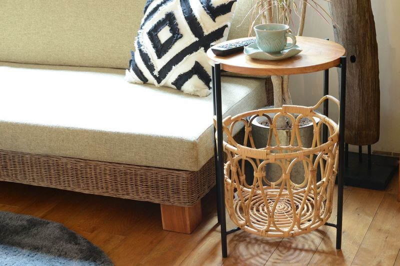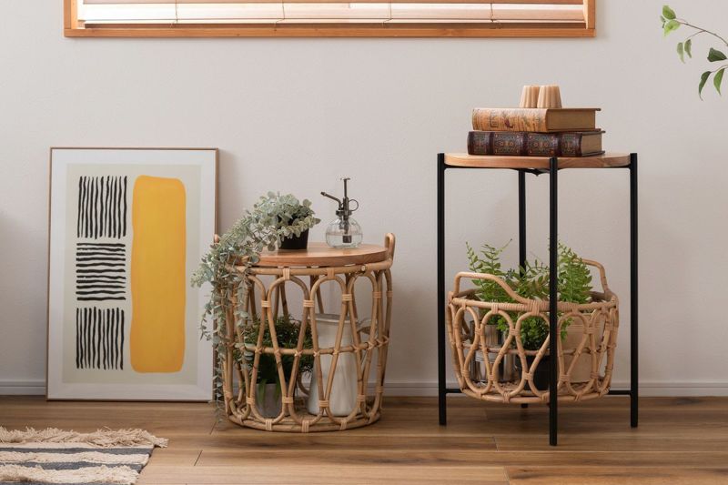 天板のウッドやバスケットのラタン素材があたたかさを演出しながら脚部にスチールを使用する事で引き締まった印象になります。