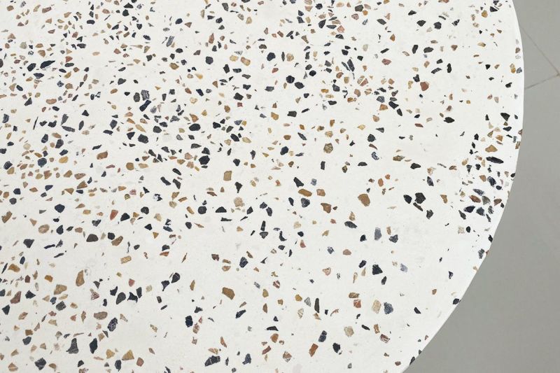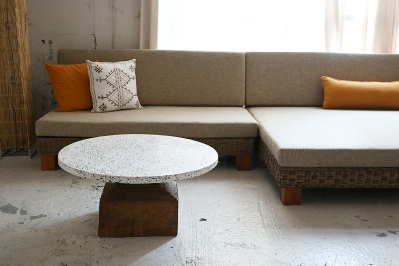 大理石や花崗岩などの天然石を粉砕した砕石をセメントや樹脂と混ぜ合わせ、硬化後に表面を研磨して仕上げた人工大理石「テラゾー」。複数の色やパターンが混ざり合ったデザインが特徴で、モダンなインテリアに適しています。
