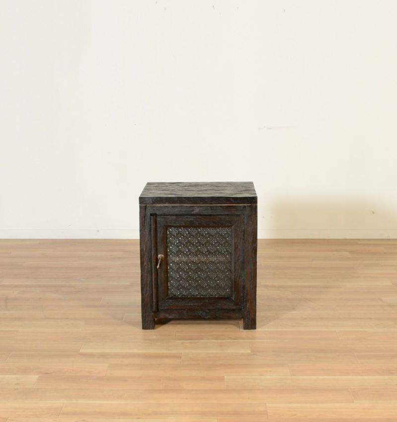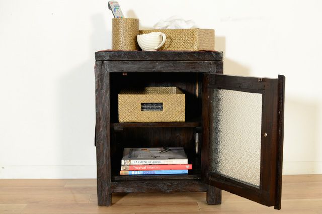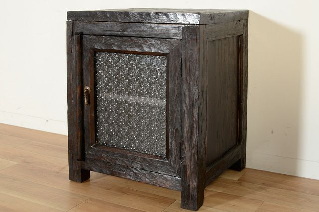サイドにはまったガラスはレトロな柄の型押しがされたジャワガラス。木部分は、無垢のチーク材を少し荒削りさを残した独特の仕上がりにしています。自然素材にこだわって作り上げるKAJAの家具だからこそ、安定感があり、とても丈夫な作りです。1点1点手作業にて製作しているため、木肌の仕上り具合が異なり、それが味となって愛着が生まれていきます。